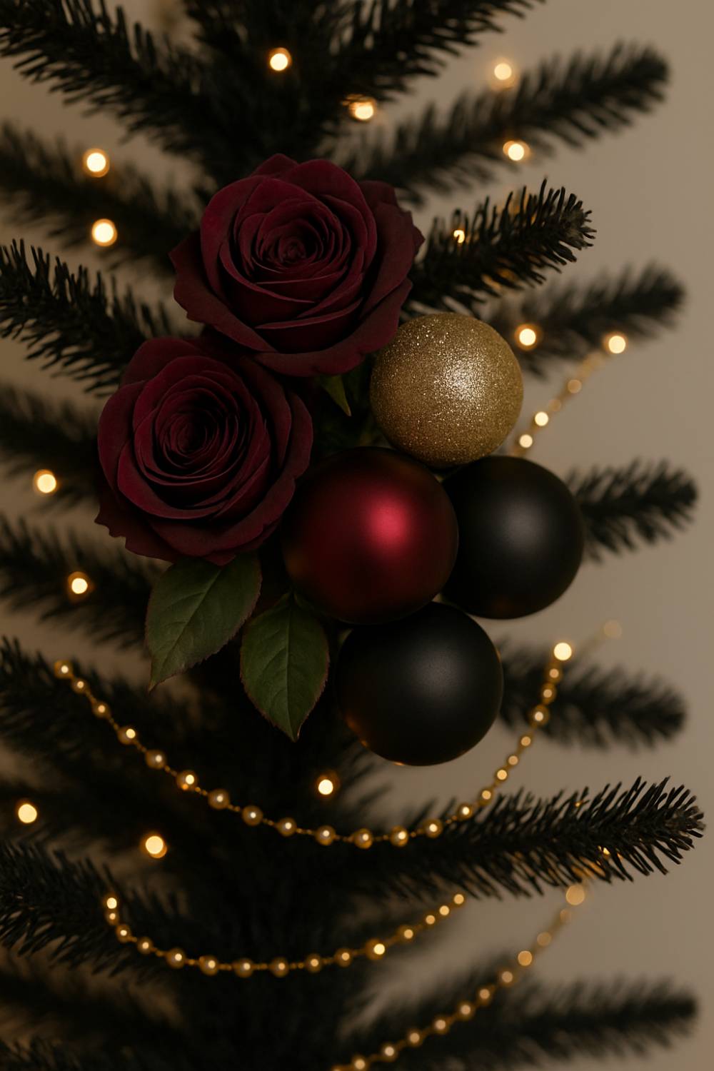 Styling ratio that rarely fails: 40% black ornaments, 40% burgundy elements (roses + ornaments), 20% gold accents. Adjust to taste.